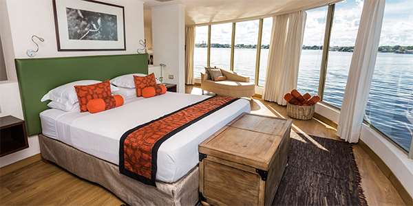 The 169-foot-long, Delfin III (formerly known as the Amazon Discovery) has been tailor made to suit its environment, while maintaining its integrity as a true luxury river cruise ship. The Delfin III offers an extraordinary level of comfort and style. The ship can accommodate a maximum of 44 cruise ship guests in 4 different styles of suites featuring floor to ceiling panoramic picture-windows. Cruise along the Amazon enjoying views of the vast rainforest full of wildlife and natural beauty from the comfort of your air-conditioned suite. This luxury river cruise ship is the perfect size to sail along the Amazon River, providing an extremely comfortable indoor and outdoor lounge, outdoor plunge pool, exercise room, spa, dining room, and sleeping accommodations.