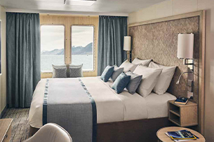 All cabins are outward-facing and feature large windows. All are equipped with climate control, an expedition command center—including tablets, multiple electrical and USB outlets, a TV, barometer, a National Geographic Atlas, and more—a mini refrigerator, small safe, and robes. Bathrooms are outfitted with a rain shower and directional showerhead, botanically inspired products, and a hair dryer. Enjoy luxury linens and pillows, as well as complimentary insulated water bottles.